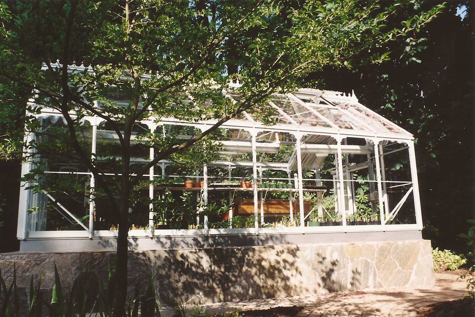 This aluminum framed glass greenhouse was raised up onto a stone base. This tiled floor is heated and has debris catch. It is plumbed with pot washing and hand washing station near the workbench. Storage for greenhouse tools and seeds is provided in sealed humidity controlled cabinetry.